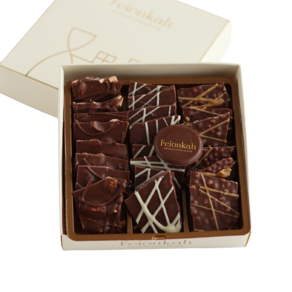 تحتوي على تشكيلة من الشوكولاتة البلجيكية الفاخرة من شرائح شوكولاتة الحليب مع اللوز المحمص المكرملوشرائح شوكولاتة الحليب مع الكرنشي وشرائح شوكولاتة الحليب الكرسبيعلبة فاخرة من فيونكة للشوكولاتة بمقاس 13 * 13سمتحتوي على27 قطعة